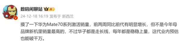 【CNMO科技音问】看成华为本年的旗舰机型,Mate70系列自觉布后就有很高的关怀度。12月18日,数码博主“数码闲聊站”走漏了我方了解的华为Mate70系列激活量情况。