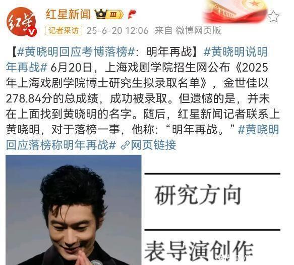 2025年6月20日,上海戏剧学院博士拟中式名单揭晓,47岁的黄晓明随机落榜,而《爱情公寓》走红的金世佳以278.84分高分逆袭上岸。黄晓明一句“来岁再战”冲上热搜,网友却集体点赞:“输多礼面,取得敬意!”这场看似遍及的考博之争,撕开了文娱圈与学术圈碰撞的奇幻本质。
