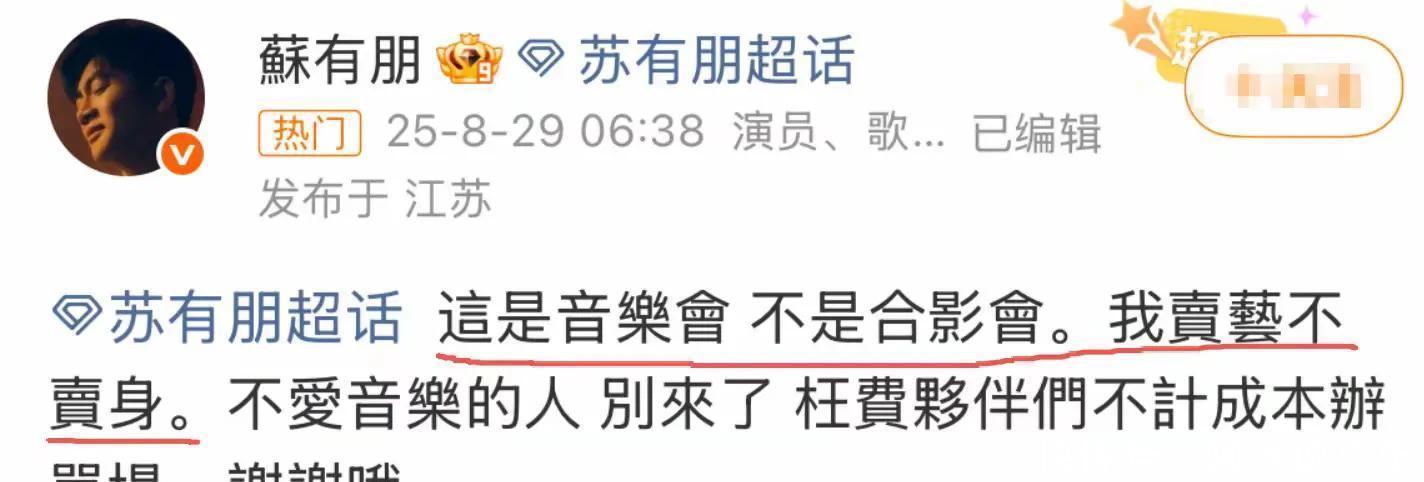 此次谁也救不了苏有一又!又当又立,发文说念歉反遭群嘲,评述区消一火 苏有一又这回是真栽了,整夜之间口碑全崩,谁王人救不转头啦!提及他,当年《还珠格格》里的五阿哥多长远东说念主心啊,简直没东说念主不知说念,演技也灵,把变装演得特确凿。而况他不光是演员,唱歌也挺利害的,实打实的实力派。 这几十年下来,非论是当演员仍是歌手,他名声一直挺好,粉丝眼里形象也可以。可谁能念念到,王人 52 岁了,果然因为北京 9 月 11 号要开的演唱会翻了车,东说念主设一下就塌了,真不知说念是原来面庞露出来了,仍是随口说错话了。 其实一运行吧,演唱会门票分 VIP 和庸俗票也普通开yun体育网,1500 的 VIP 位置好、能优先进场,还能跟他合影要签名,911 的庸俗票就只可进去看个上演。一分钱一分货,全球原来也没太珍惜这种区别。 可偏巧苏有一又我方把这事闹大了,还怼网友说 “我卖艺不卖身,不心爱音乐的就别来”,这话也太逆耳了!他一个公世东说念主物这样说,粉丝哪儿受得了啊,这不彰着又当又立嘛,真让东说念主寒心。