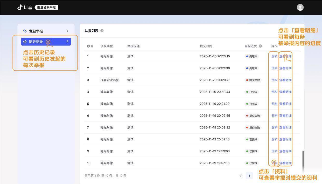 抖音PC端批量侵权举报器具赞成查询历史记载