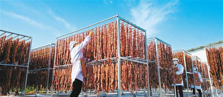 1月15日,四川省德阳市旌阳区妈仔食物有限背负公司晒场,职工在曝晒香肠、腊肉、腊排等传统脾气腊成品。唐渝川摄(中经视觉)